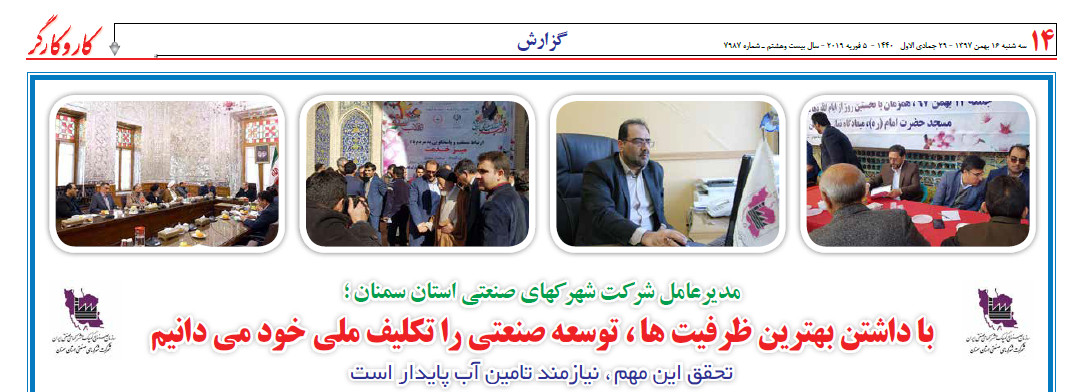 مدیرعامل شرکت شهرکهای صنعتی استان سمنان در گفتگوي خبري به مناسبت چهلمين سالگرد پيروزي انقلاب اسلامي؛ با داشتن بهترین ظرفیت ها، توسعه صنعتی را تکلیف ملی خود می دانیم و تحقق این مهم، نیازمند تامین آب پایدار است .