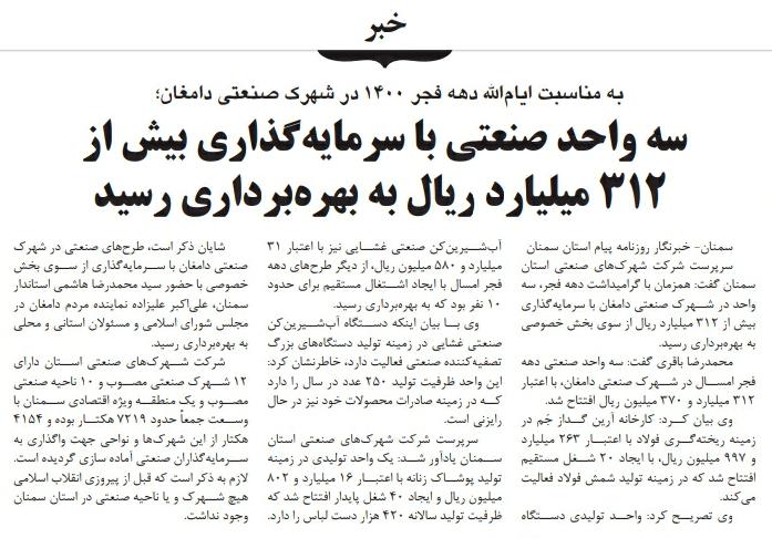 بهره برداری از سه واحد صنعتی با سرمایه گذاری ۳۱۲ میلیارد ریالی در دامغان