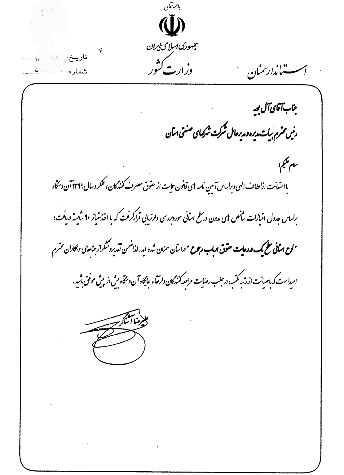 كسب لوح رعايت حقوق ارباب رجوع توسط شركت شهرك‌هاي صنعتي استان سمنان