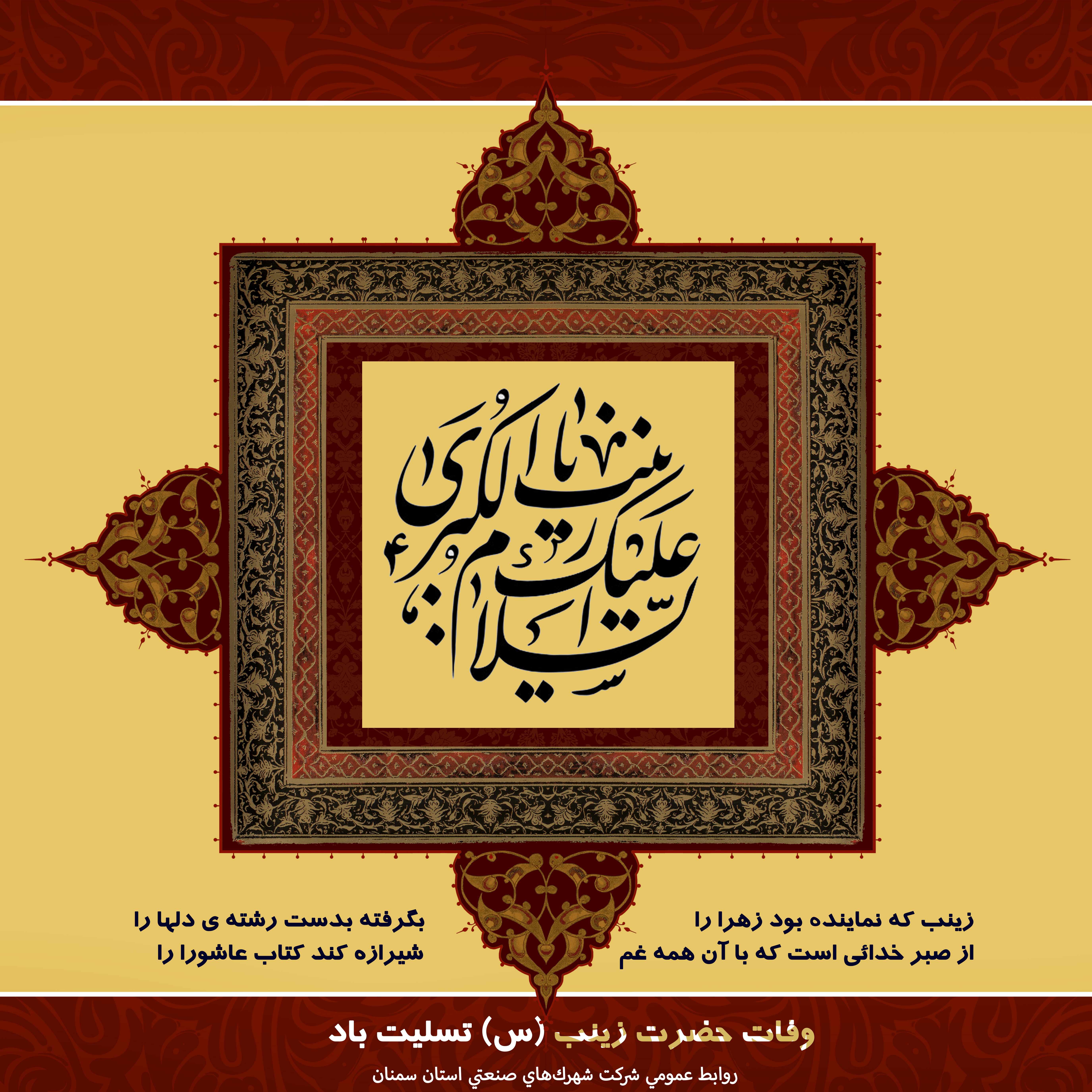 ای پرچم کربلا به دوشت، زینب / قربان تو و خشم و خروشت، زینب تا موی سرت سپید شد از غم دوست / شد کعبه دل سیاهپوشت زینب وفات حضرت زینب (س) تسلیت باد