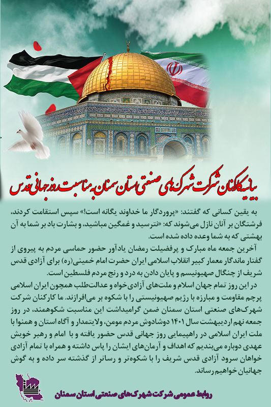بيانيه كاركنان شركت شهرك‌هاي صنعتي استان سمنان به مناسبت روز جهاني قدس