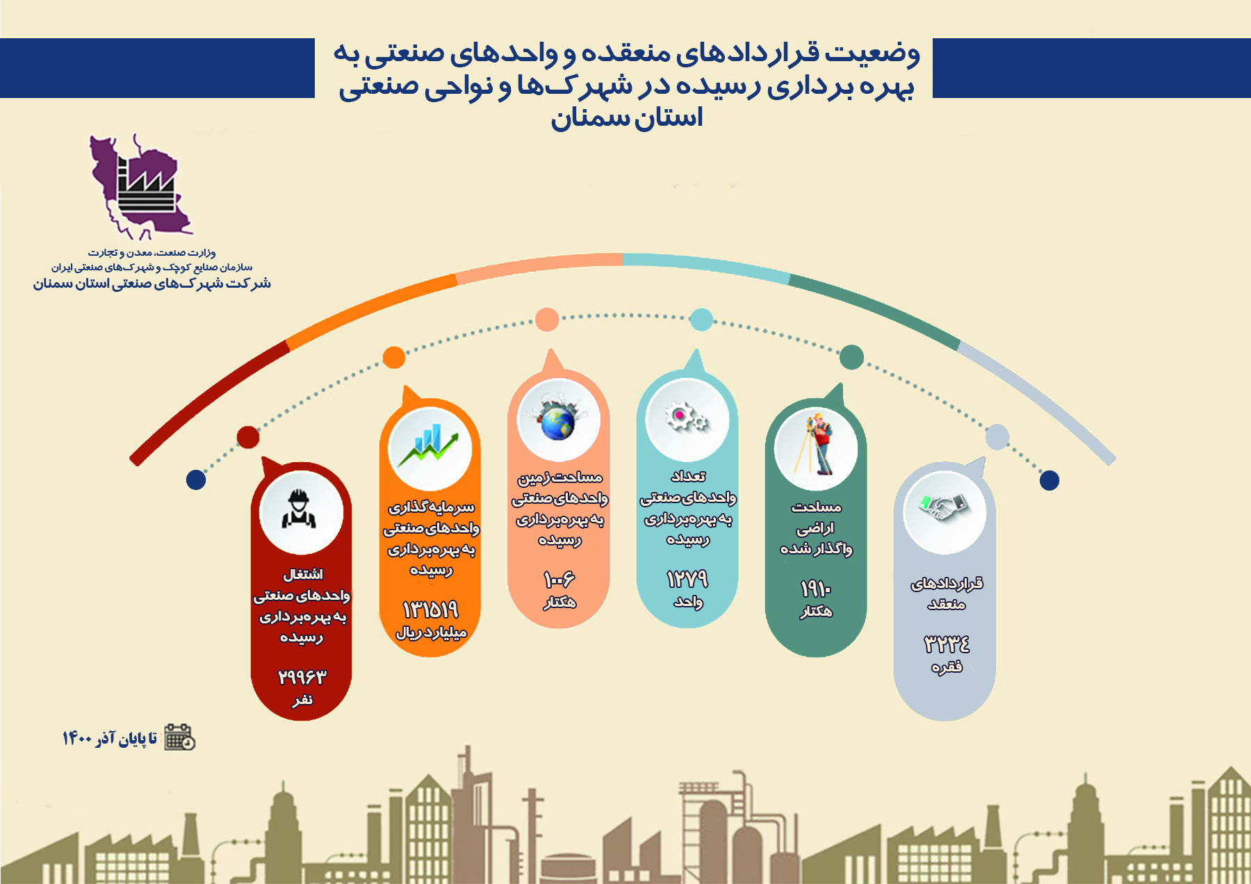 تا پايان آذر 1400، سه هزار و 234 فقره قرارداد واگذاري اراضي با متقاضيان سرمايه گذاري در شهرك‌ها و نواحي صنعتي استان سمنان منعقده شده و يك هزار و 279 واحد صنعتي در اين مناطق به بهره برداري رسيده است.