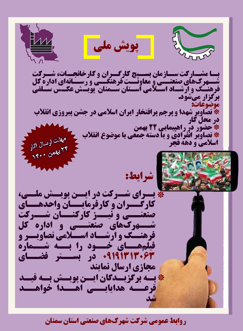 پويش عكس سلفي ويژه كارگران و كارفرمايان واحدهاي صنعتي، كاركنان شركت شهرك‌هاي صنعتي و اداره كل فرهنگ و ارشاد اسلامي استان سمنان برگزار مي‌شود.