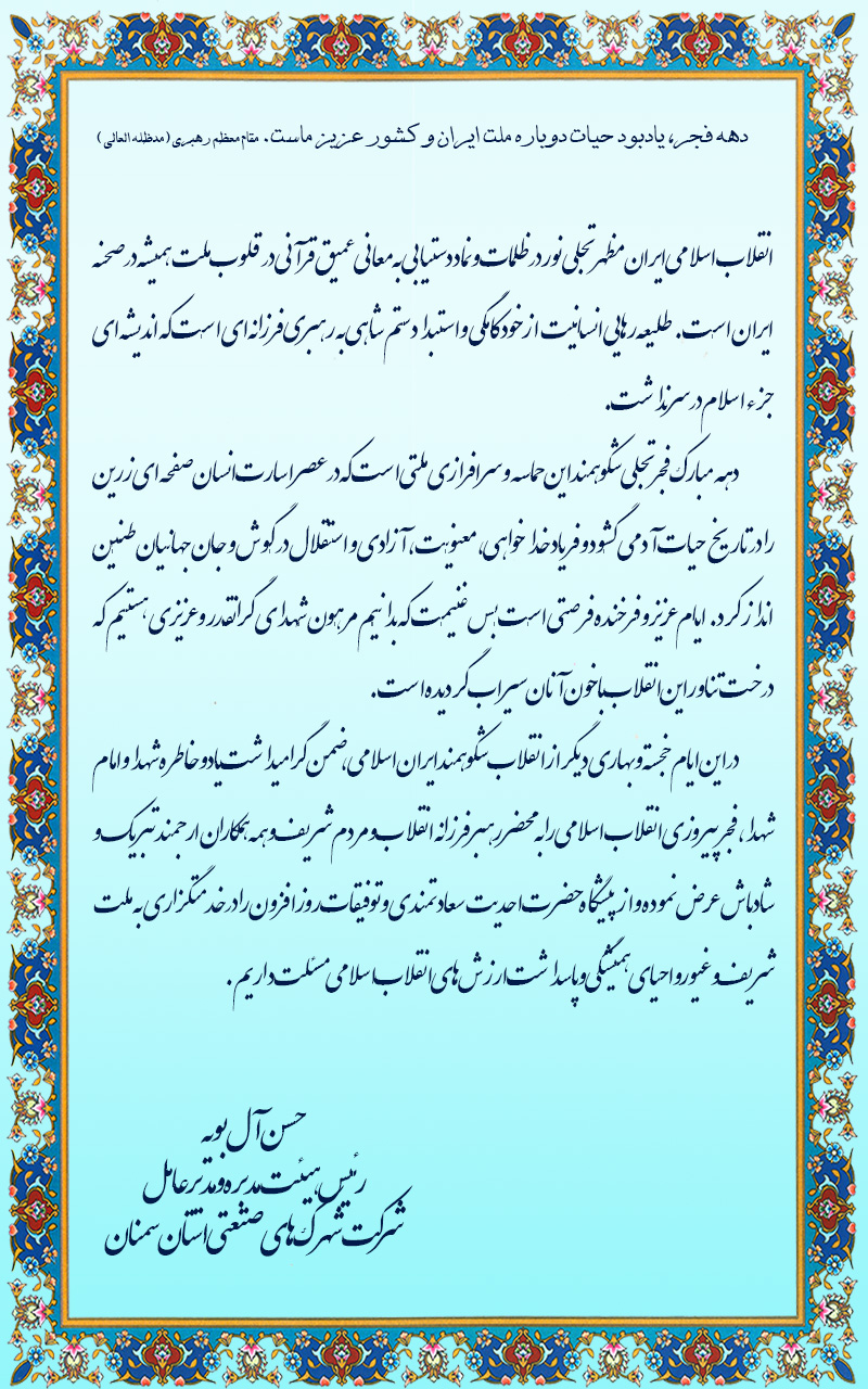 در این ایام خجسته و بهاری دیگر از انقلاب شکوهمند ایران اسلامی، ضمن گرامیداشت یاد و خاطره شهدا و امام شهدا، فجر پیروزی انقلاب اسلامی را به محضر رهبر فرزانه انقلاب و مردم شریف و همه همکاران ارجمند تبریک و شادباش عرض نموده و از پیشگاه حضرت احدیت سعادتمندی و توفیقات روز افزون را در خدمتگزاری به ملت شریف و غیور و احیای همیشگی و پاسداشت ارزش‌های انقلاب اسلامی مسئلت داریم.