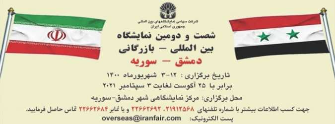 به گزارش روابط عمومي شركت شهركهاي صنعتي استان سمنان، پاویون جمهوری اسلامی ایران در شصت و دومین نمایشگاه بینالمللی بازرگانی دمشق/سوریه شهریور ماه 1400 توسط شرکت سهامی نمایشگاههای بینالمللی جمهوری اسلامی ایران به عنوان مجری نمایشگاه برگزار ميشود.